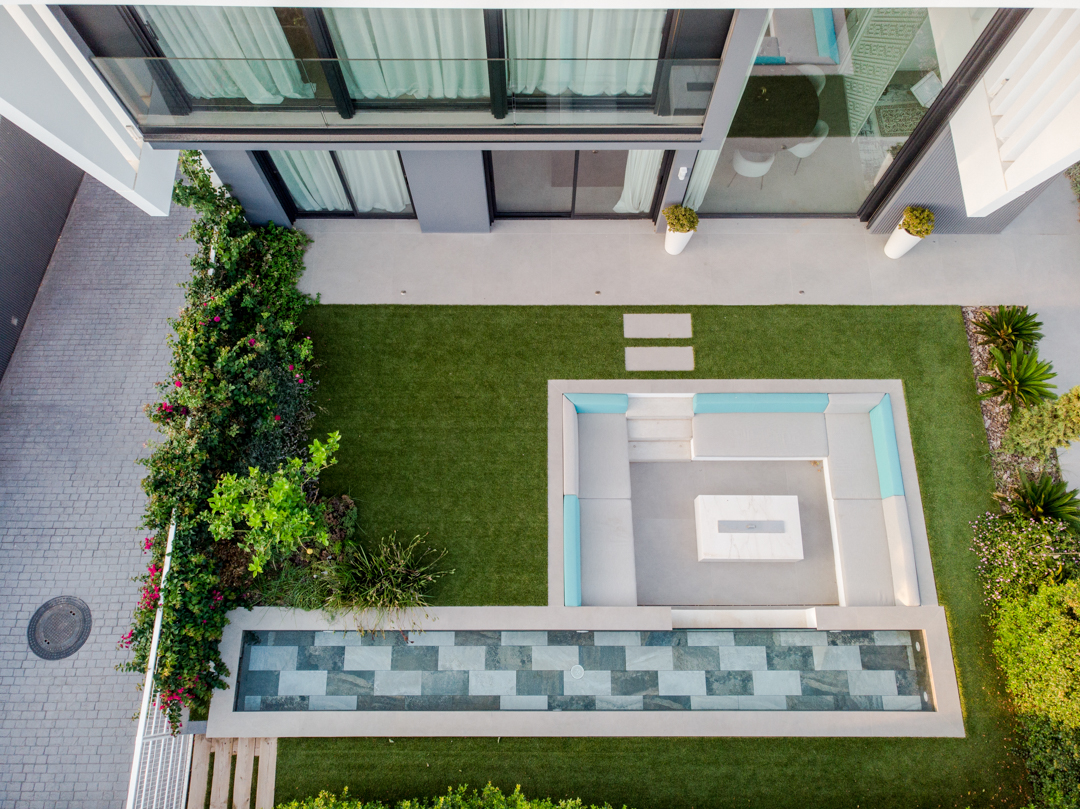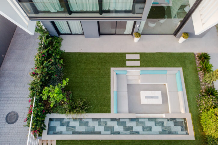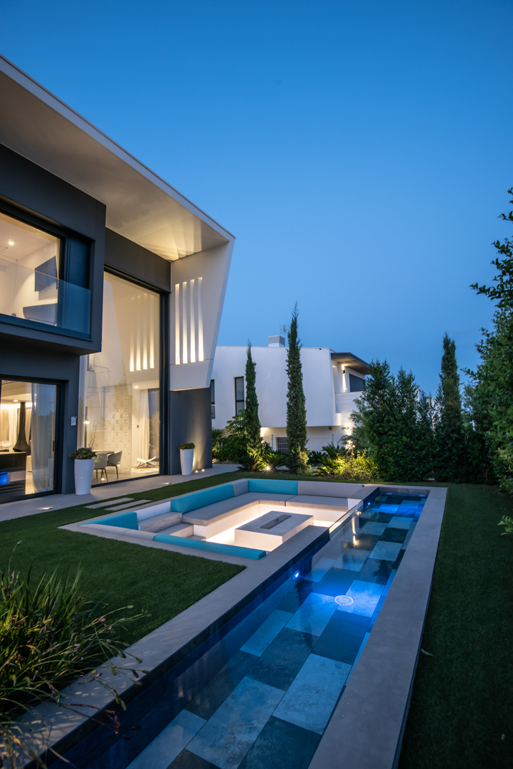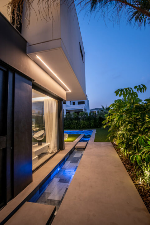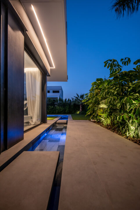 Al sud de la parcel.la exterior vam dissenyar una gran zona chill out, al costat d’una llàmina d’aigua amb forma de piscina allargada, espai destinat per l’ùs de les persones adultes, mentre que al costat nord vàrem projectar una piscina de més grans dimensions per les filles dels propietaris, connectada amb l’entrada de la vivenda gràcies a una segona llàmina d’aigua més estreta, que recorre un dels laterals de la casa,