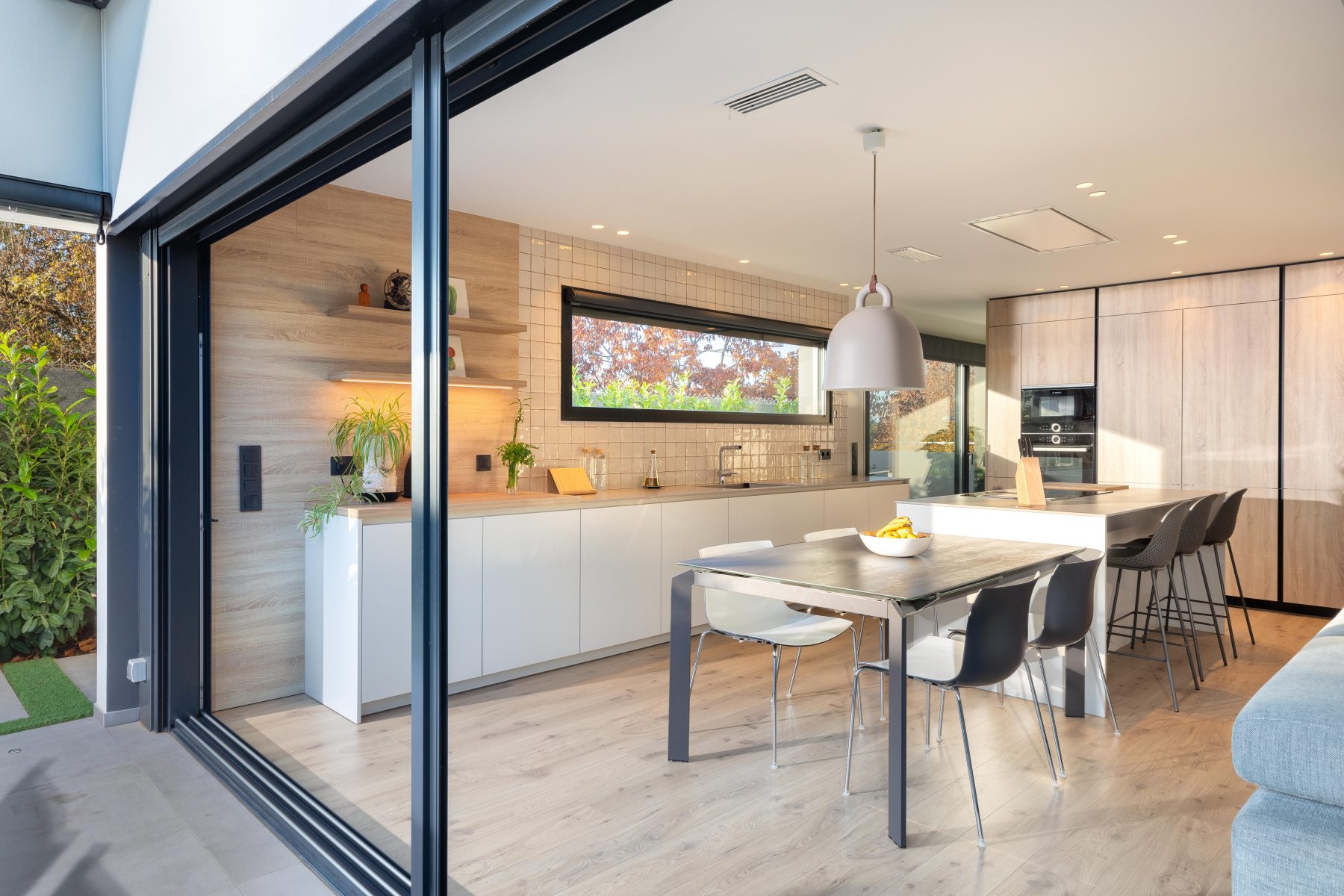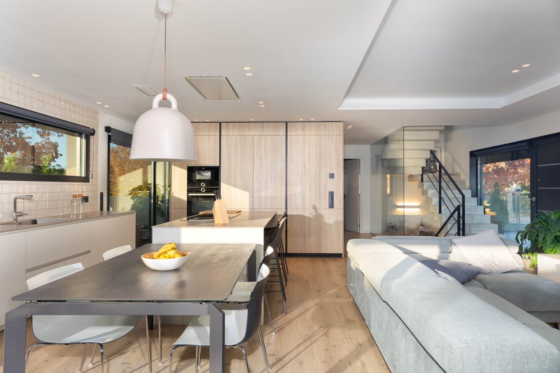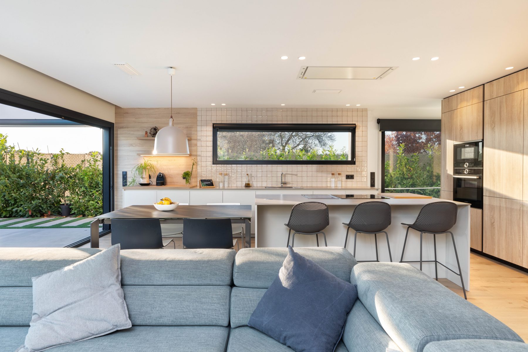 Els acabats càlids i confortables del disseny dels interiors contrasten de forma elegant amb l’estètica de la façana, afegint personalitat i caràcter al conjunt. La fusta es converteix en un dels elements principals d’aquest interiorisme, utilitzada com a paviment general de la vivenda, a més del mobiliari i el mòdul principal de la cuina, en el que s’instal.la la columna de forn i microones, la nevera integrada i la zona d’emmagatzematge.