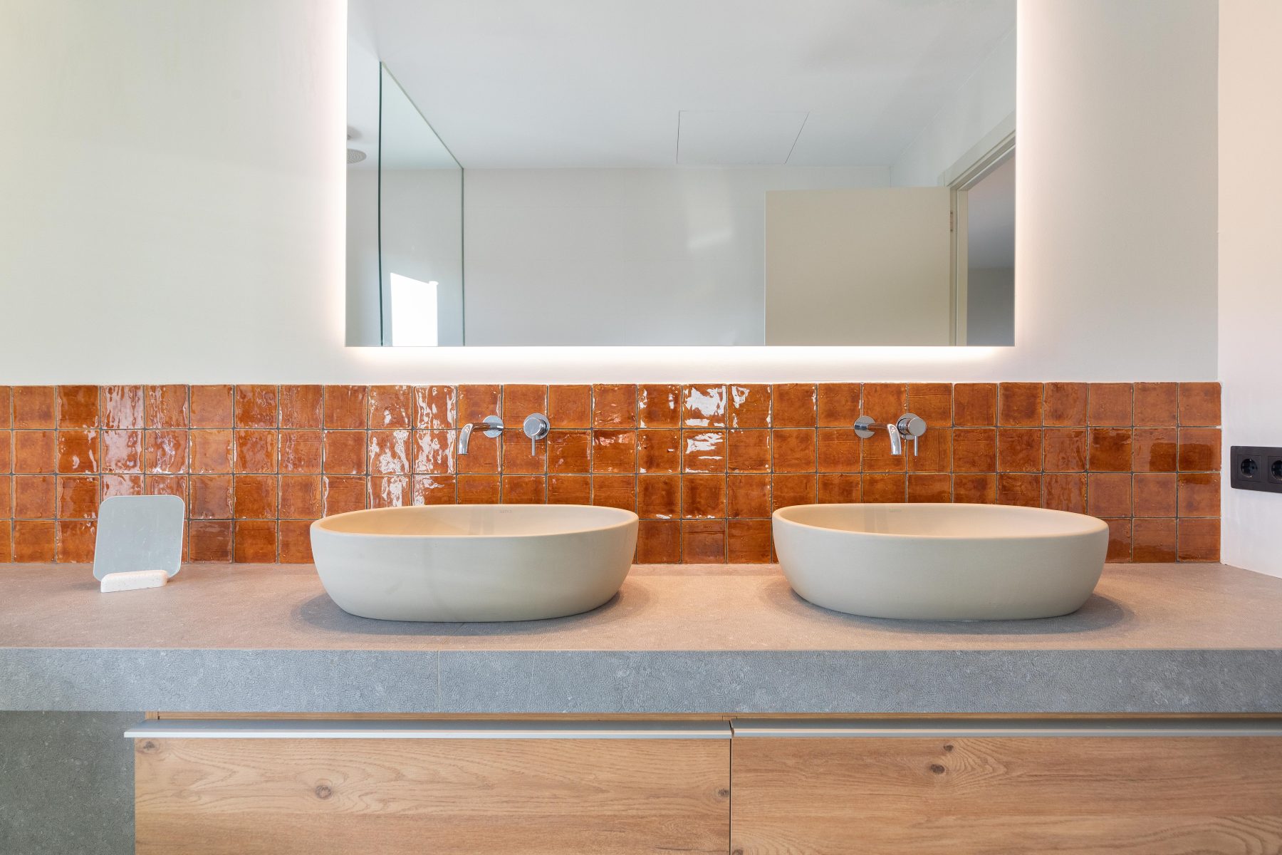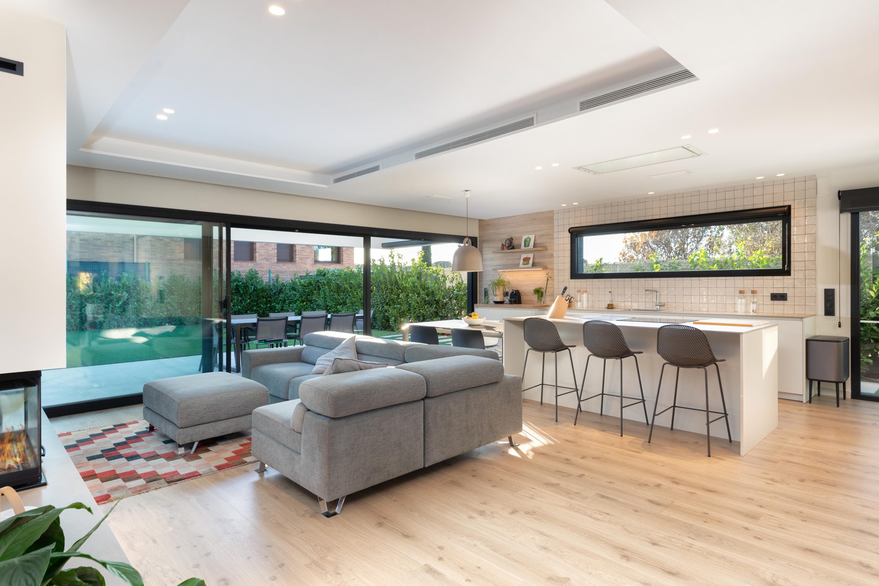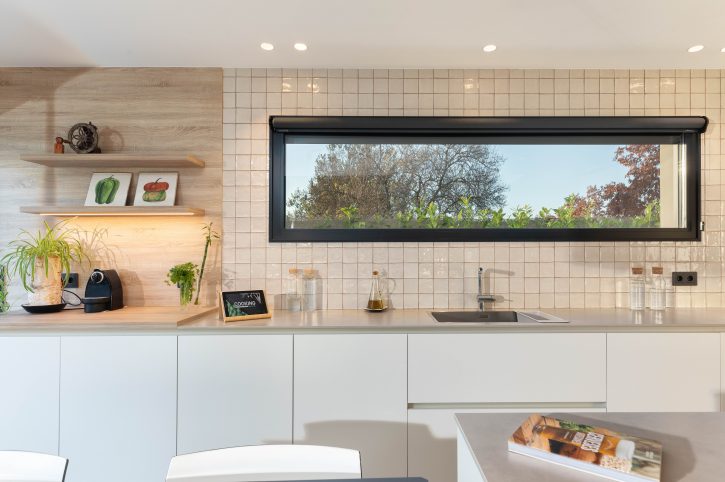 Els acabats càlids i confortables del disseny dels interiors contrasten de forma elegant amb l’estètica de la façana, afegint personalitat i caràcter al conjunt. La fusta es converteix en un dels elements principals d’aquest interiorisme, utilitzada com a paviment general de la vivenda, a més del mobiliari i el mòdul principal de la cuina, en el que s’instal.la la columna de forn i microones, la nevera integrada i la zona d’emmagatzematge.