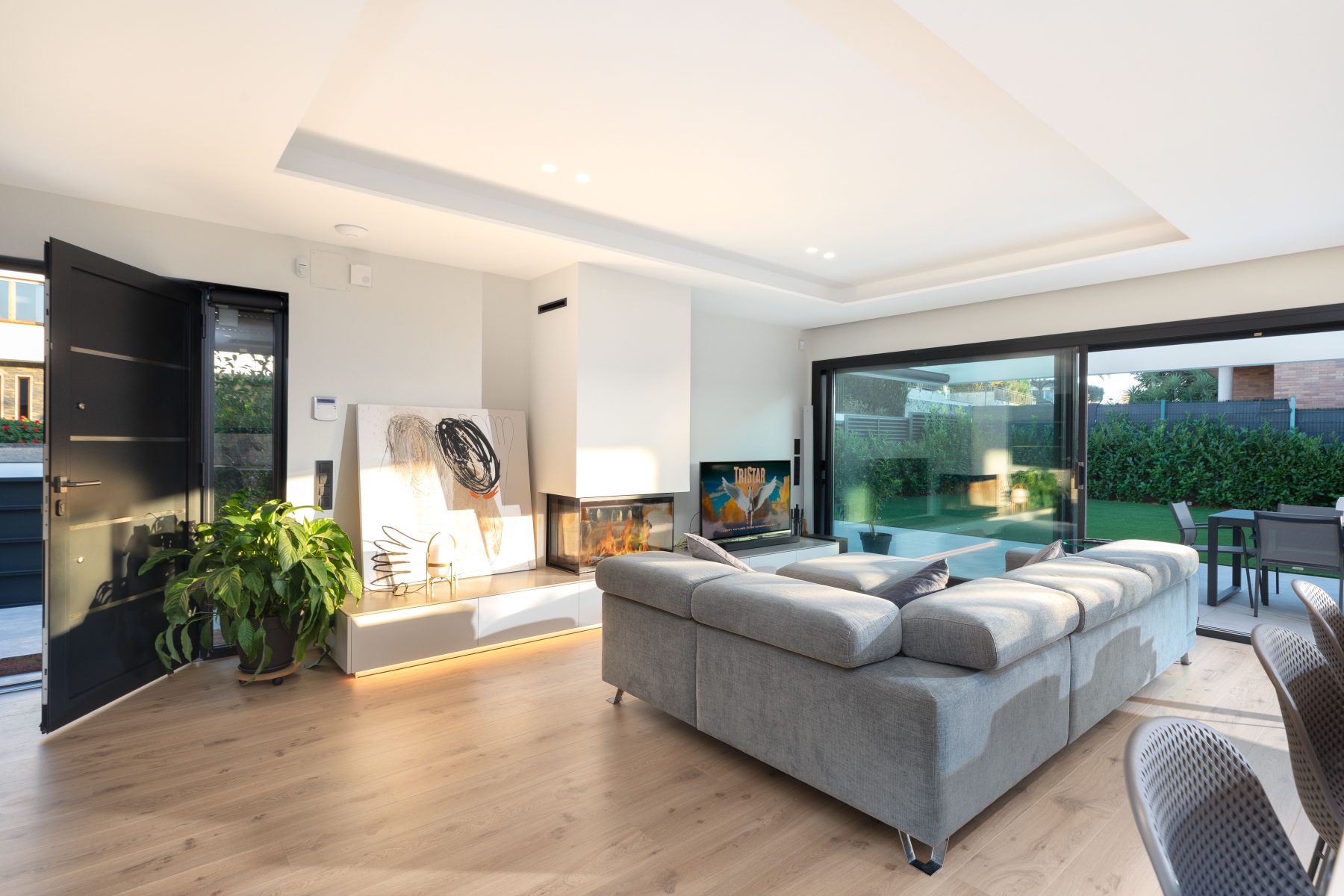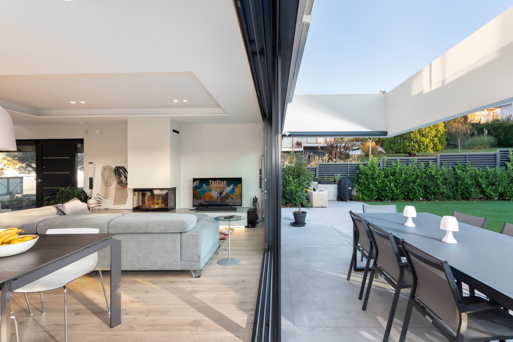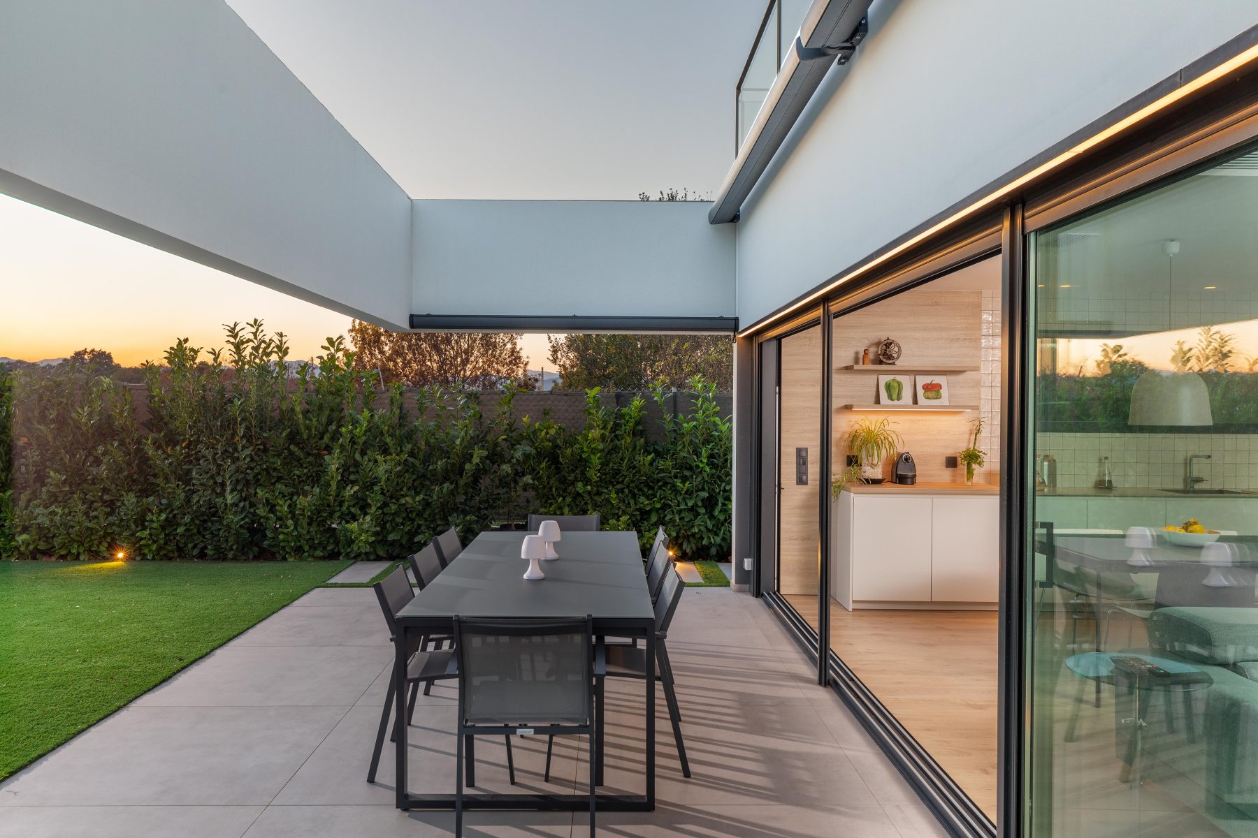 A la planta baixa, orientada a sud, hi trobem la zona d’estar, el menjador i la cuina, en una configuració oberta, comunicada directament amb el jardí exterior i el original porxo projectat pel nostre equip, sota una estructura oberta, que por cobrir-se amb un tendal mòbil, quan es necessita.