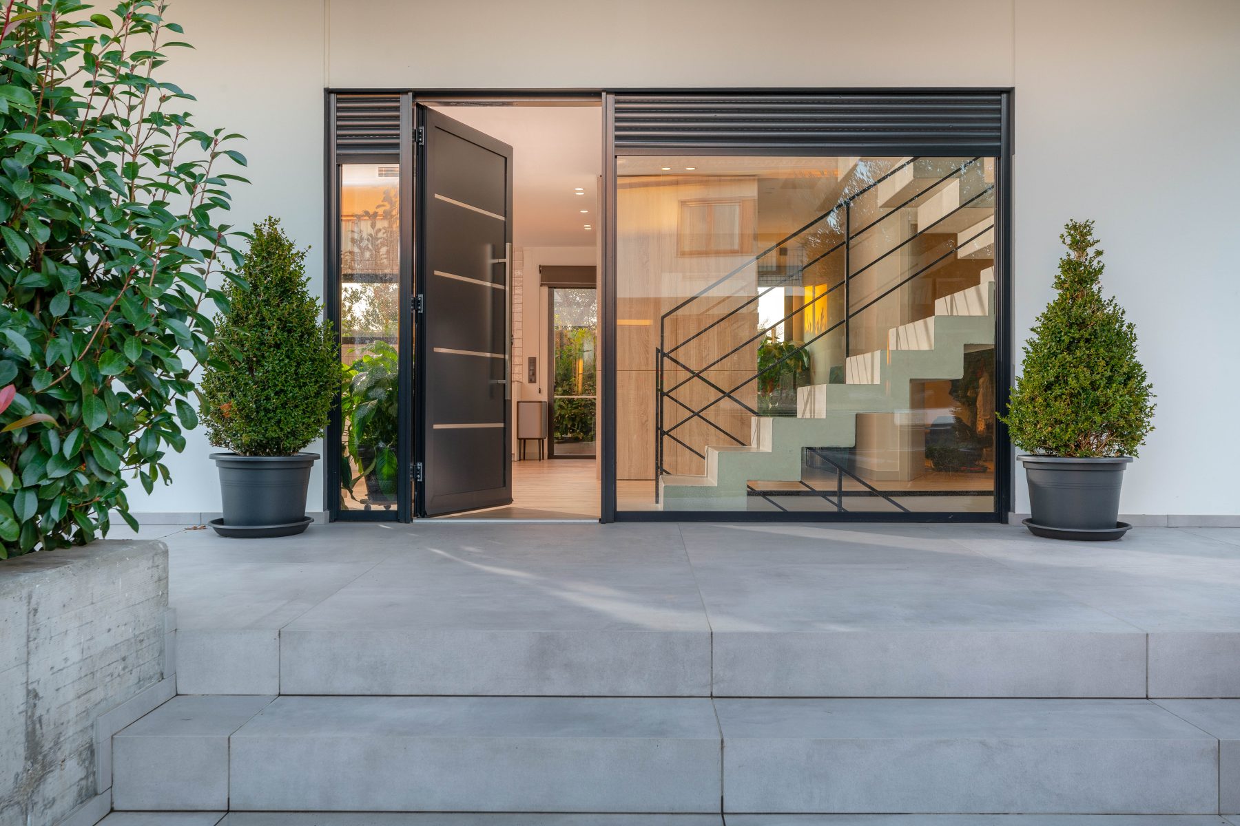 La zona volada que es genera a la primera planta coincideix amb l’entrada de la vivenda, de forma que aconseguim projectar una zona d’accés més protegida.