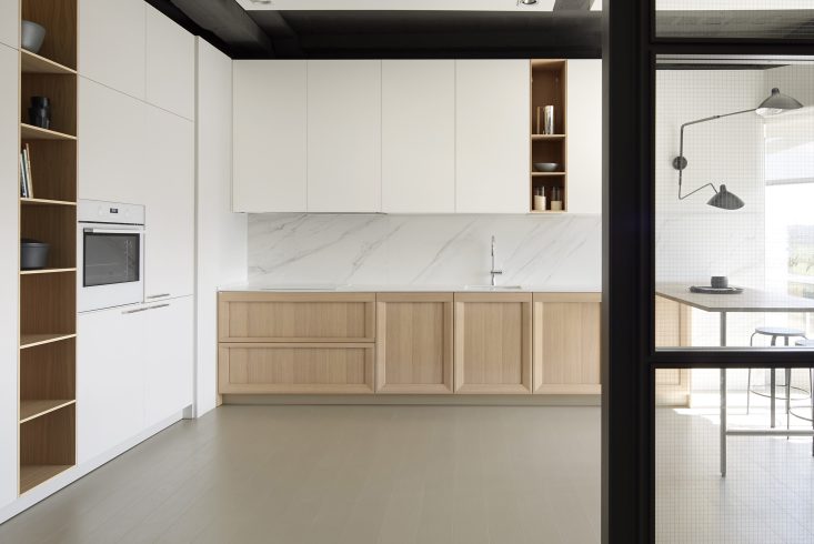 Colores blancos, tierras y grises que combinan con la cálida textura de la madera de abeto y el porcelánico de las encimeras.