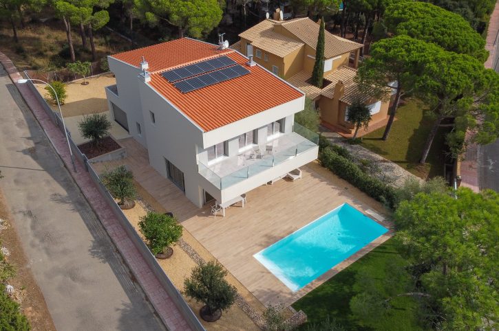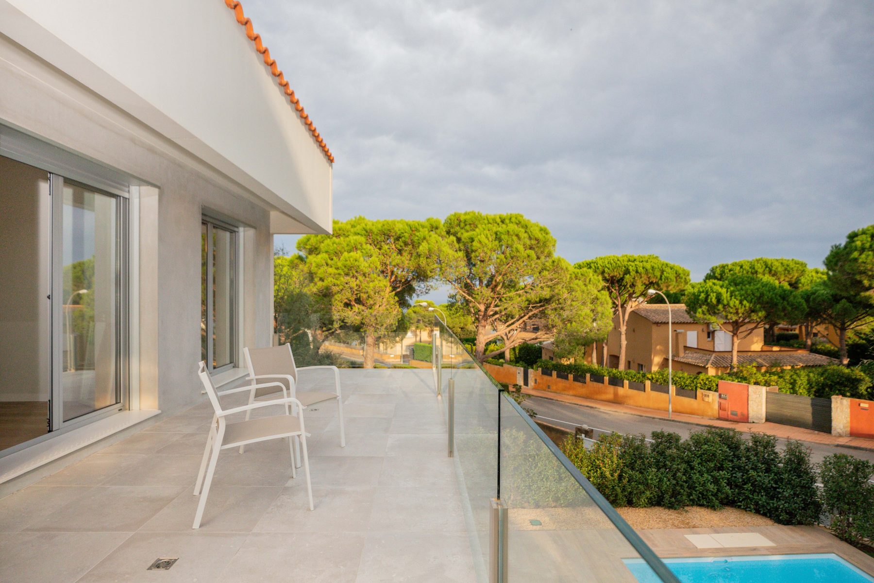 On the first floor, accessible via a concrete staircase, we find the sleeping area, with the bedrooms and bathrooms and a large terrace with views to the sea, the back garden and the swimming pool.