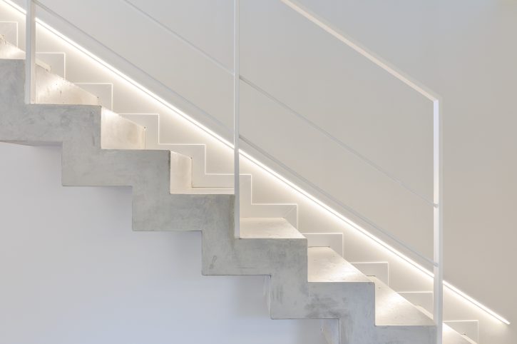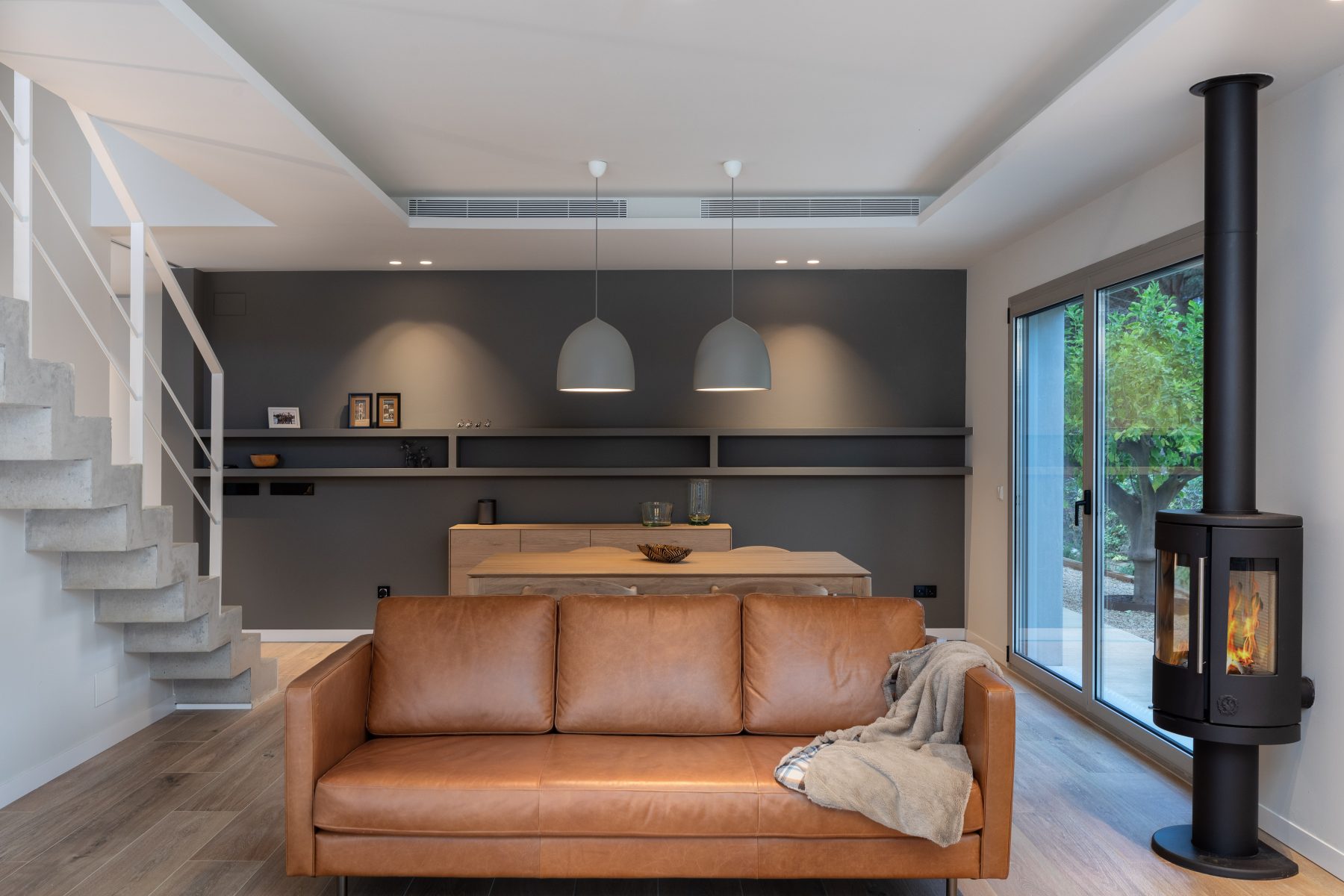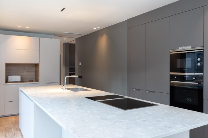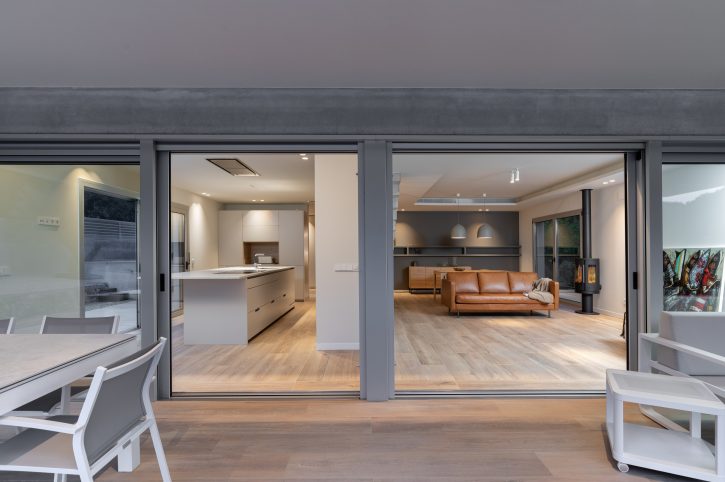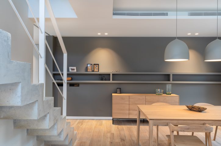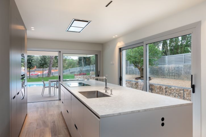In its lower part, the house is divided into a basement, where the garage is located and the ground floor, where we can find the day area, with the living and dining room on one side and the kitchen separated by a wall. This last area hosts the panelled fridge, the oven and microwave column and the storage area, in dark grey, as an element of chromatic contrast with the large kitchen island, which includes the water and cooking areas, in a pristine white colour.