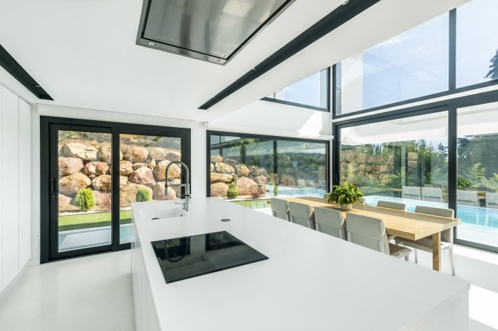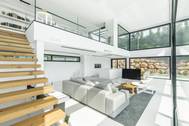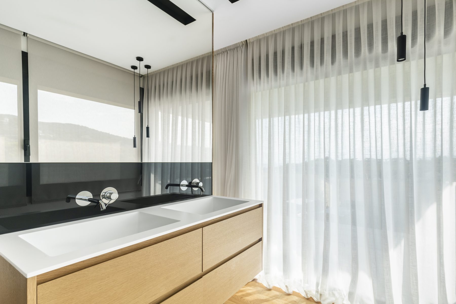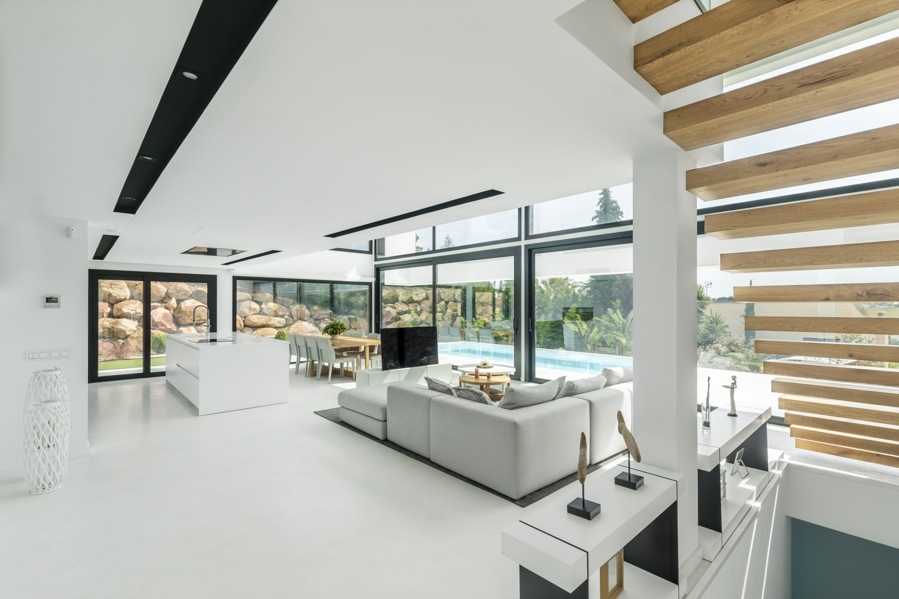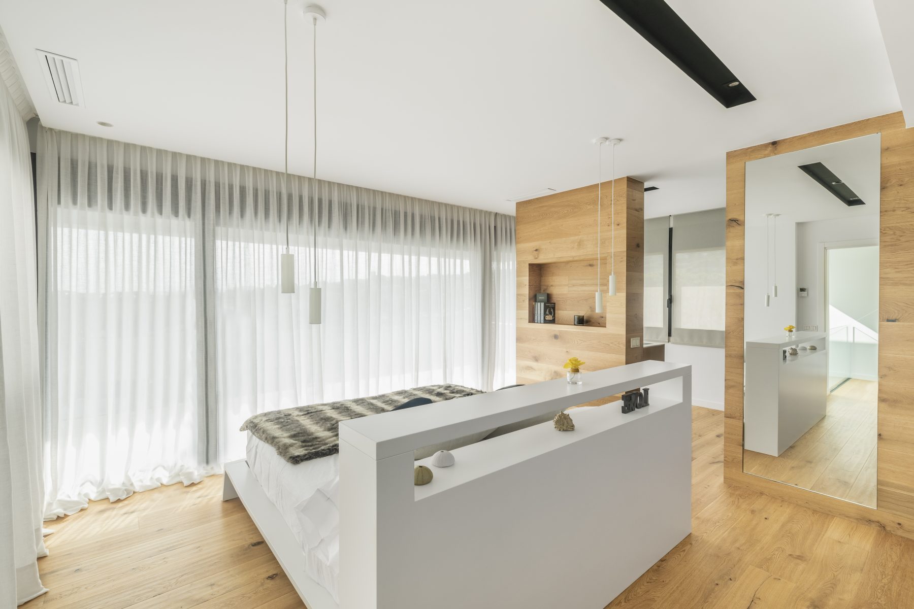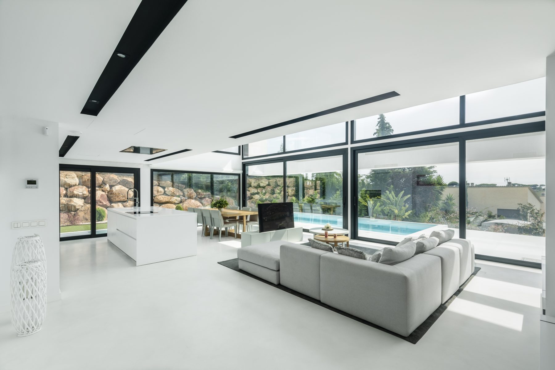 Las grandes cristaleras que ocupan las fachadas de la vivienda inundan de luz natural la totalidad de las estancias, convirtiéndose en mirador privilegiado del entorno que la rodea.