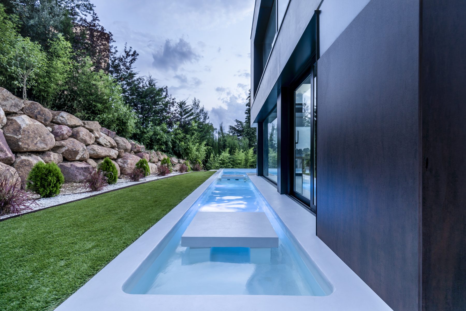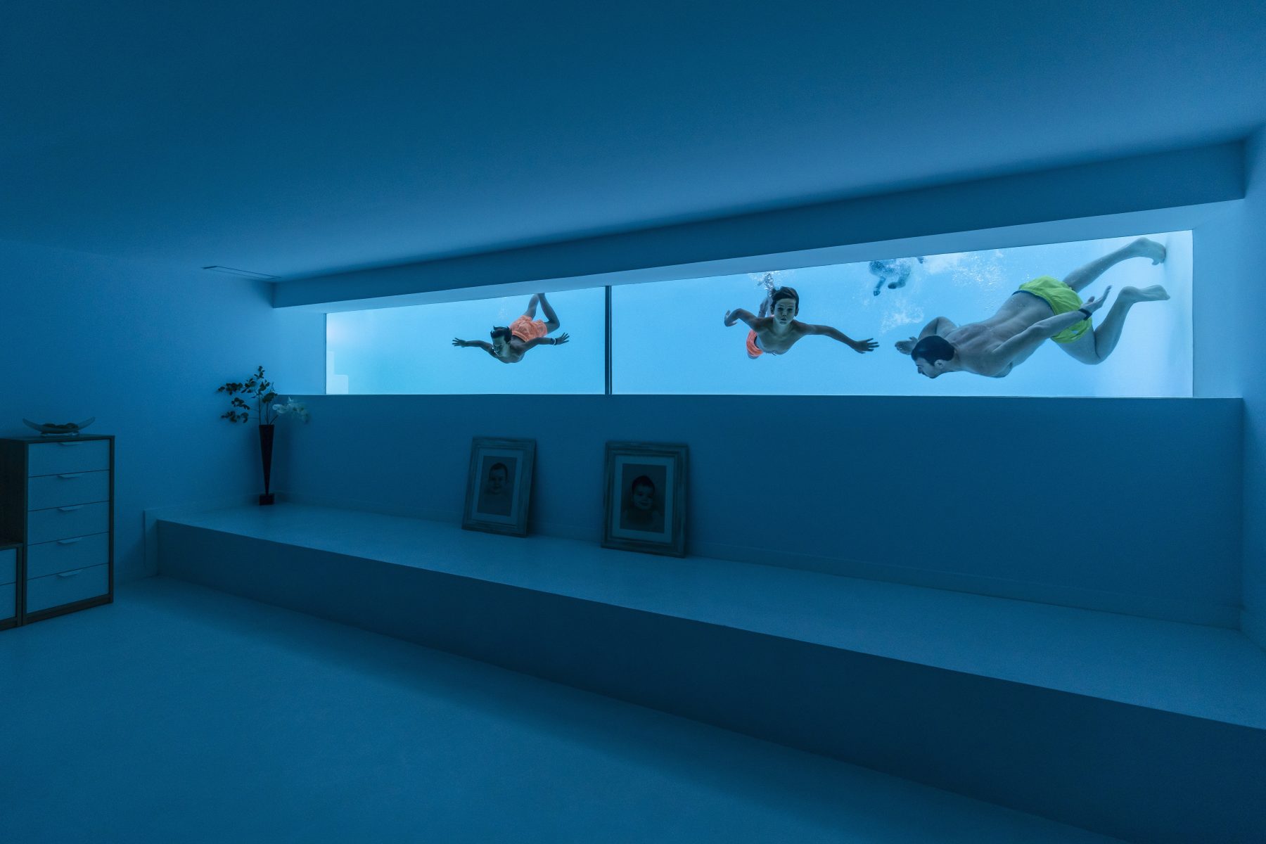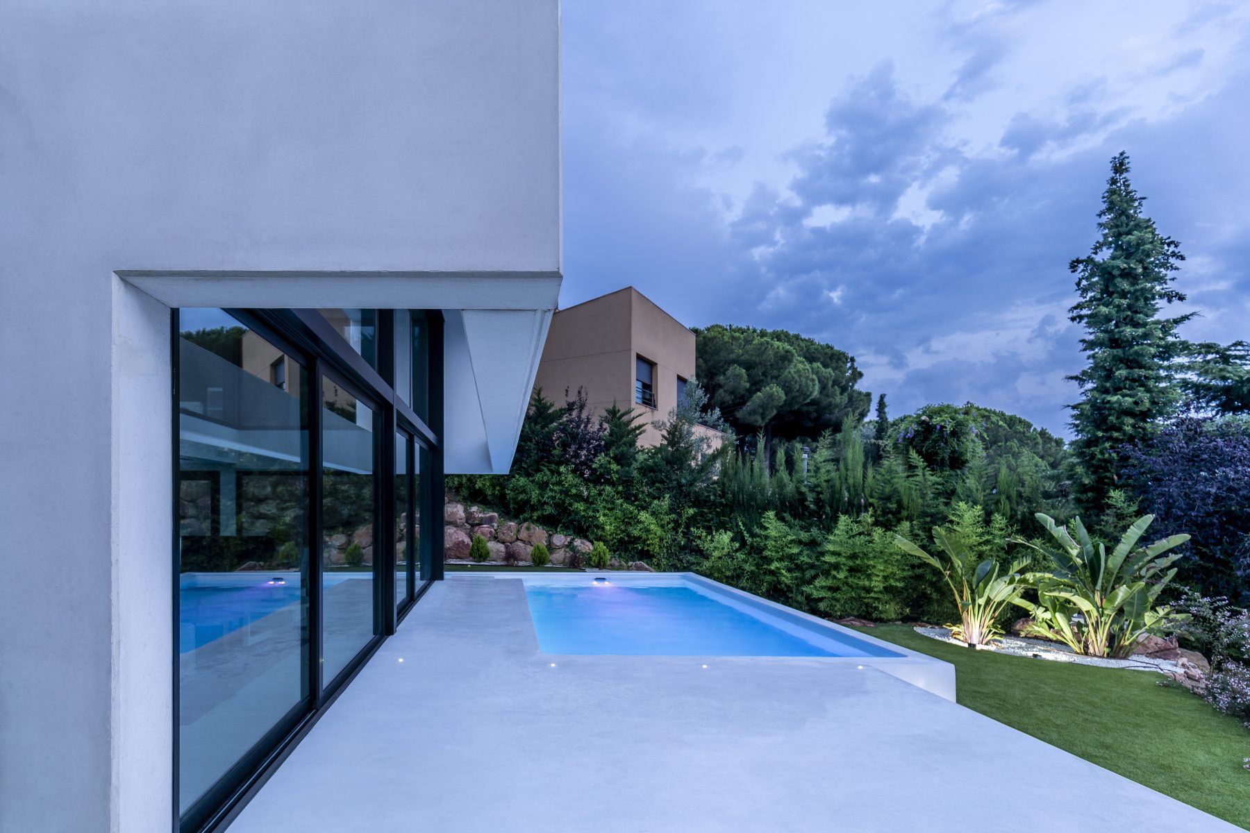 Frente al porche exterior ordenamos la piscina en forma de L, que rodea el volumen destinado a la zona de día. Además, esta piscina incorpora una ventana que es la protagonista de una gran sala polivalente situada en la planta sótano.