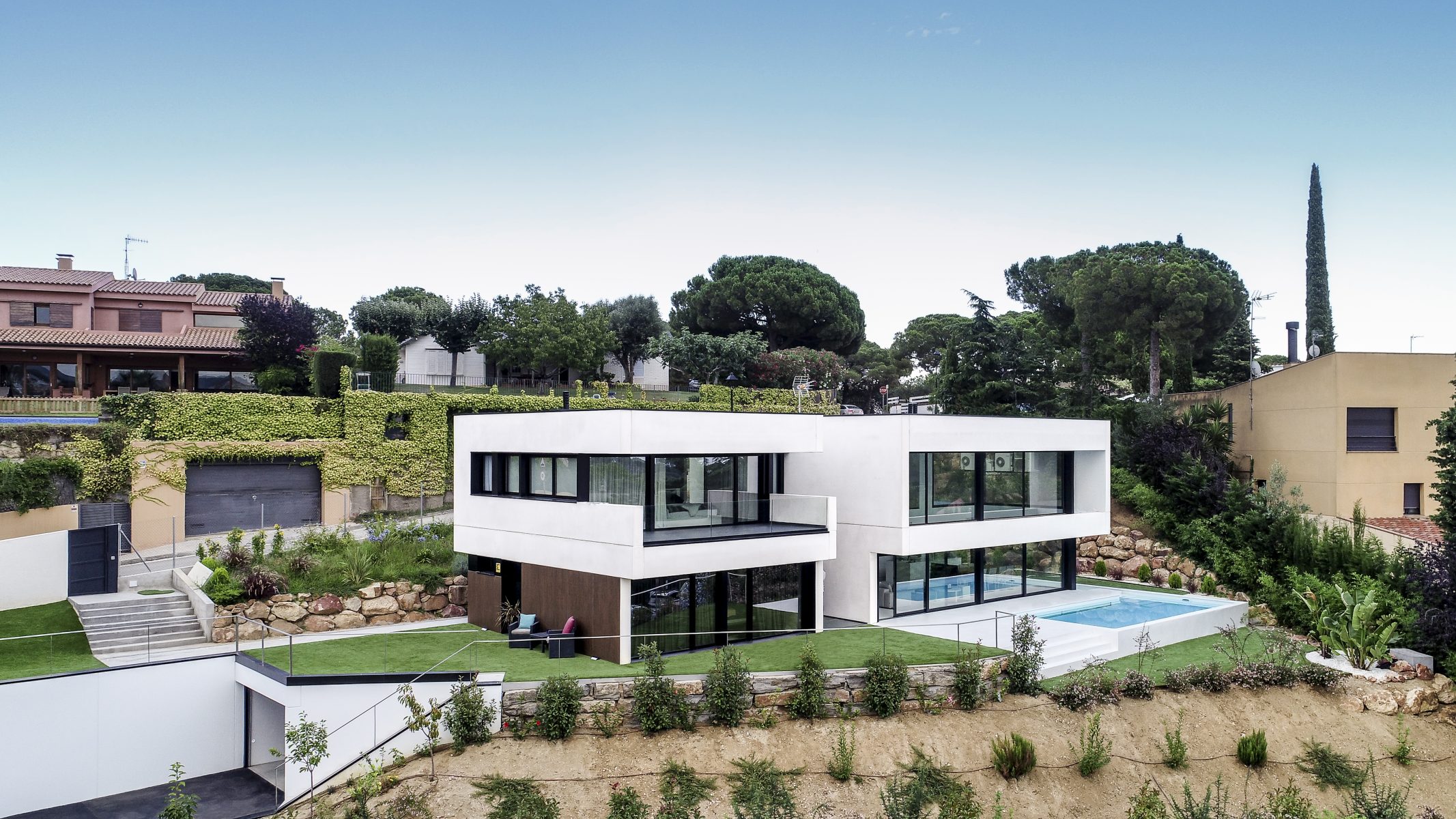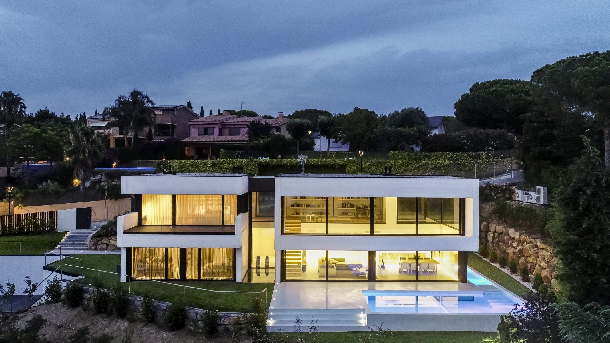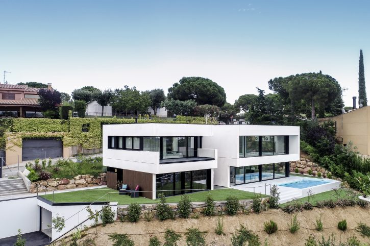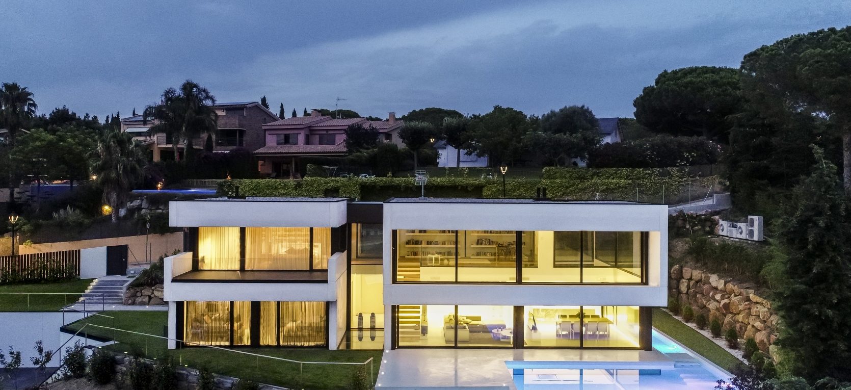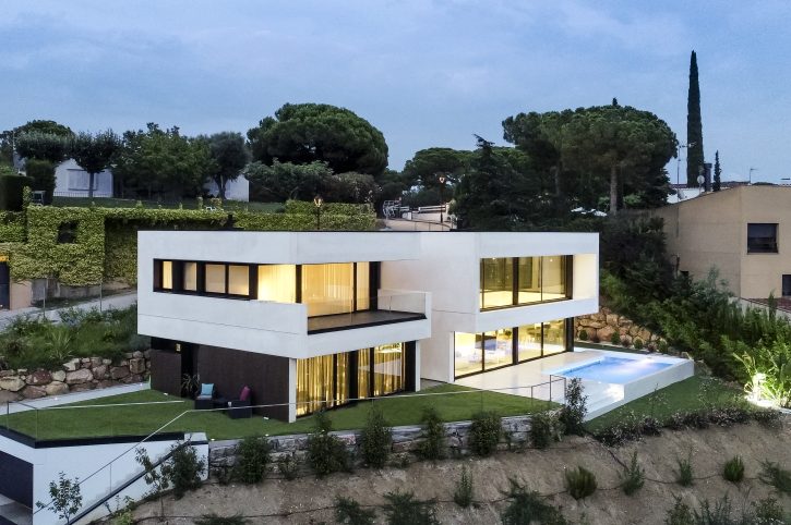 Esta vivienda de arquitectura contemporánea situada en el Maresme, cerca de Barcelona, destaca a nivel arquitectónico por el diseño de dos grandes volúmenes unidos por una pieza transparente, que sirve como elemento de comunicación entre ambos.
