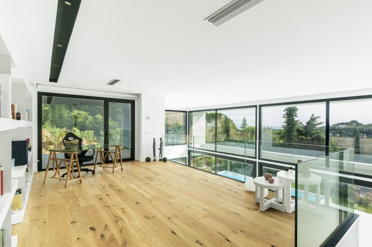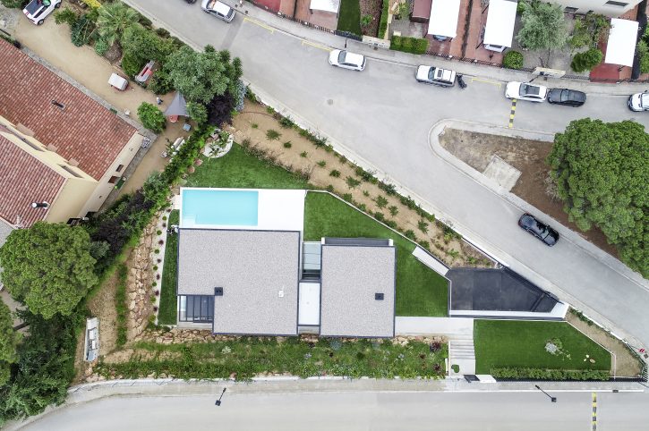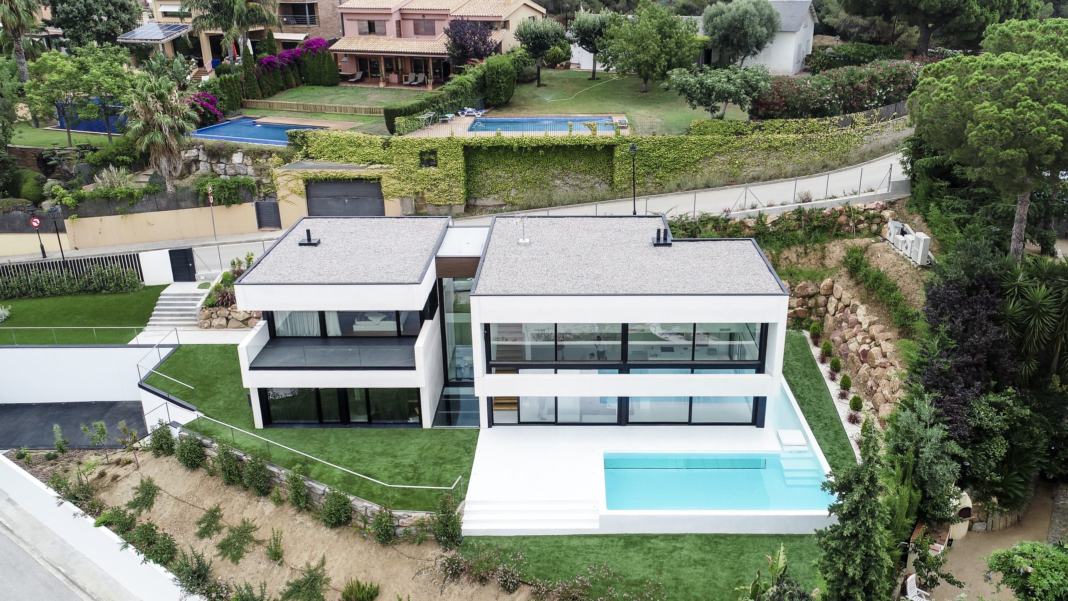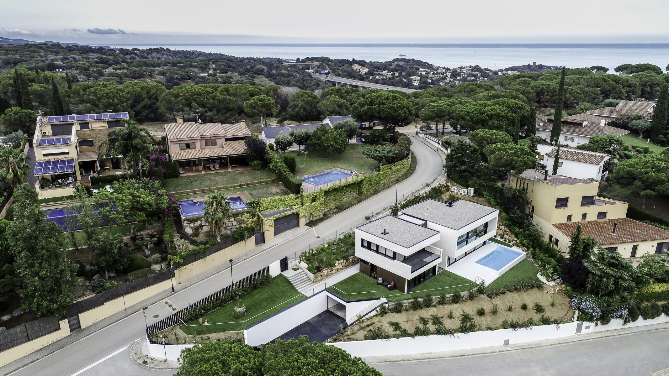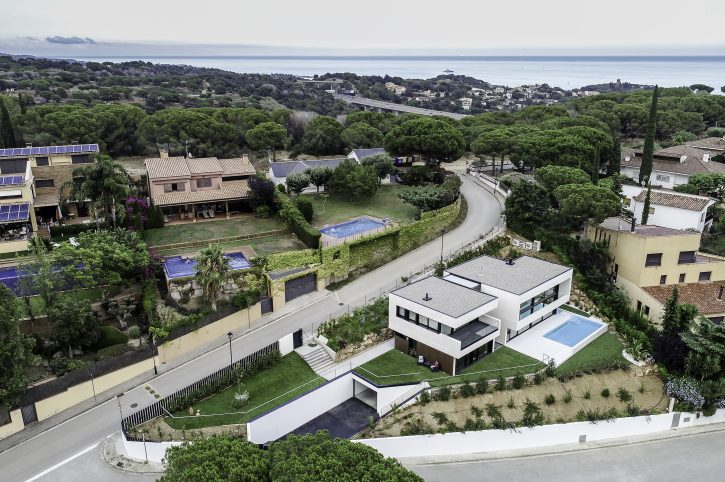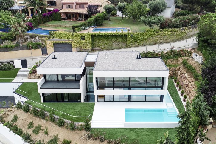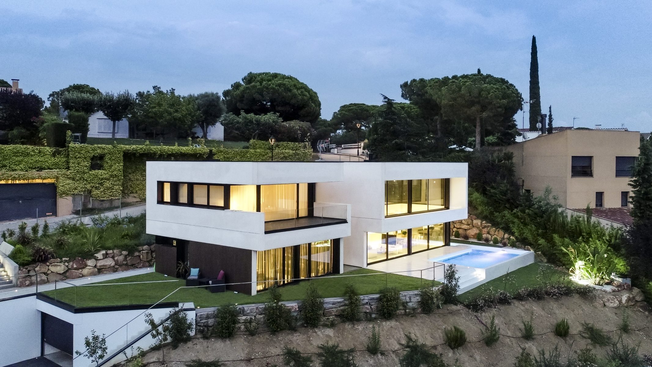 Esta vivienda de arquitectura contemporánea situada en el Maresme, cerca de Barcelona, destaca a nivel arquitectónico por el diseño de dos grandes volúmenes unidos por una pieza transparente, que sirve como elemento de comunicación entre ambos.
