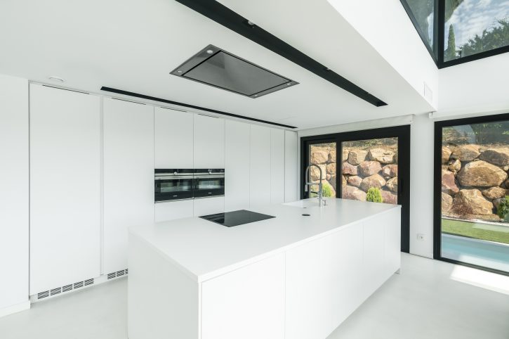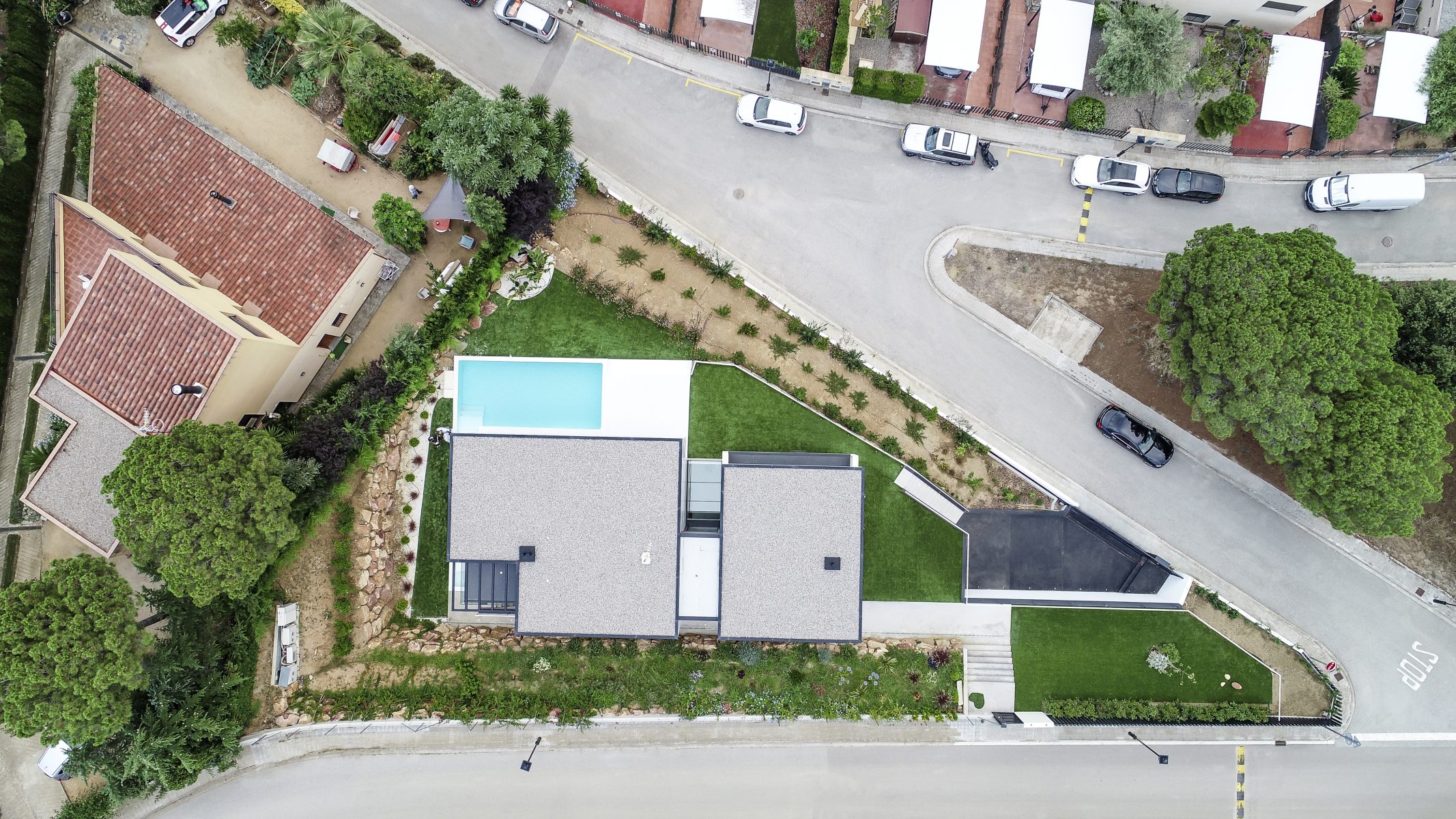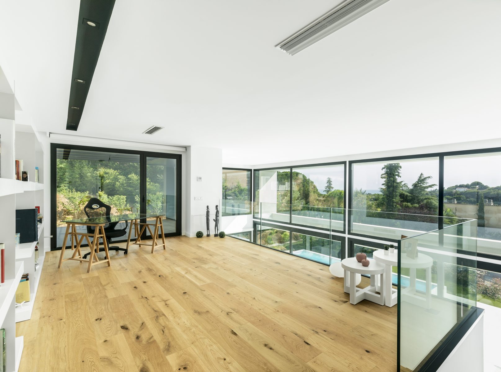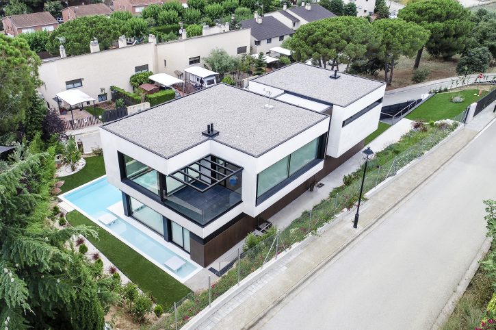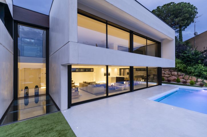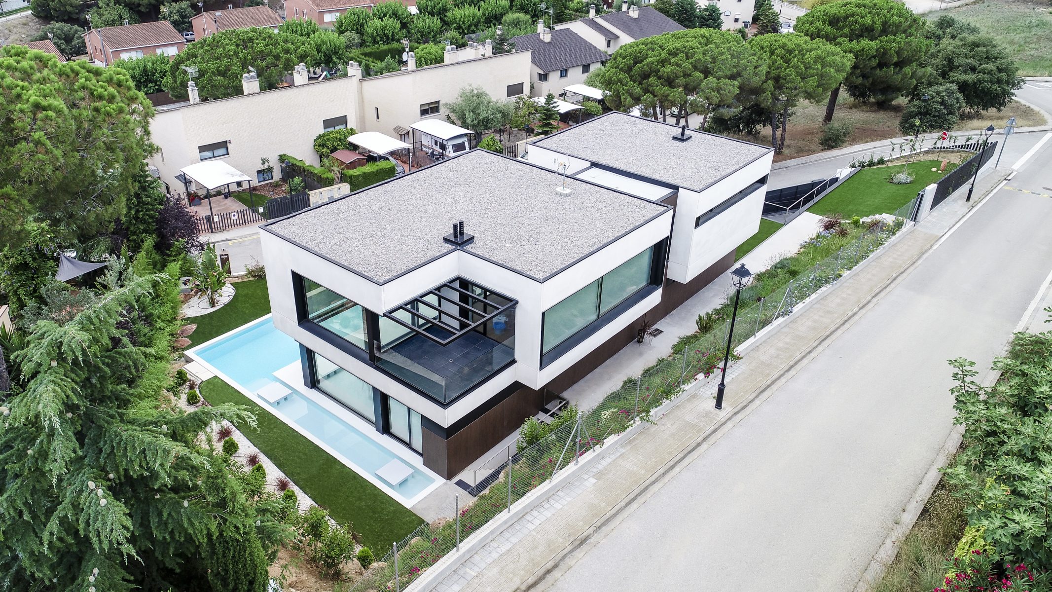 Esta vivienda de arquitectura contemporánea situada en el Maresme, cerca de Barcelona, destaca a nivel arquitectónico por el diseño de dos grandes volúmenes unidos por una pieza transparente, que sirve como elemento de comunicación entre ambos.