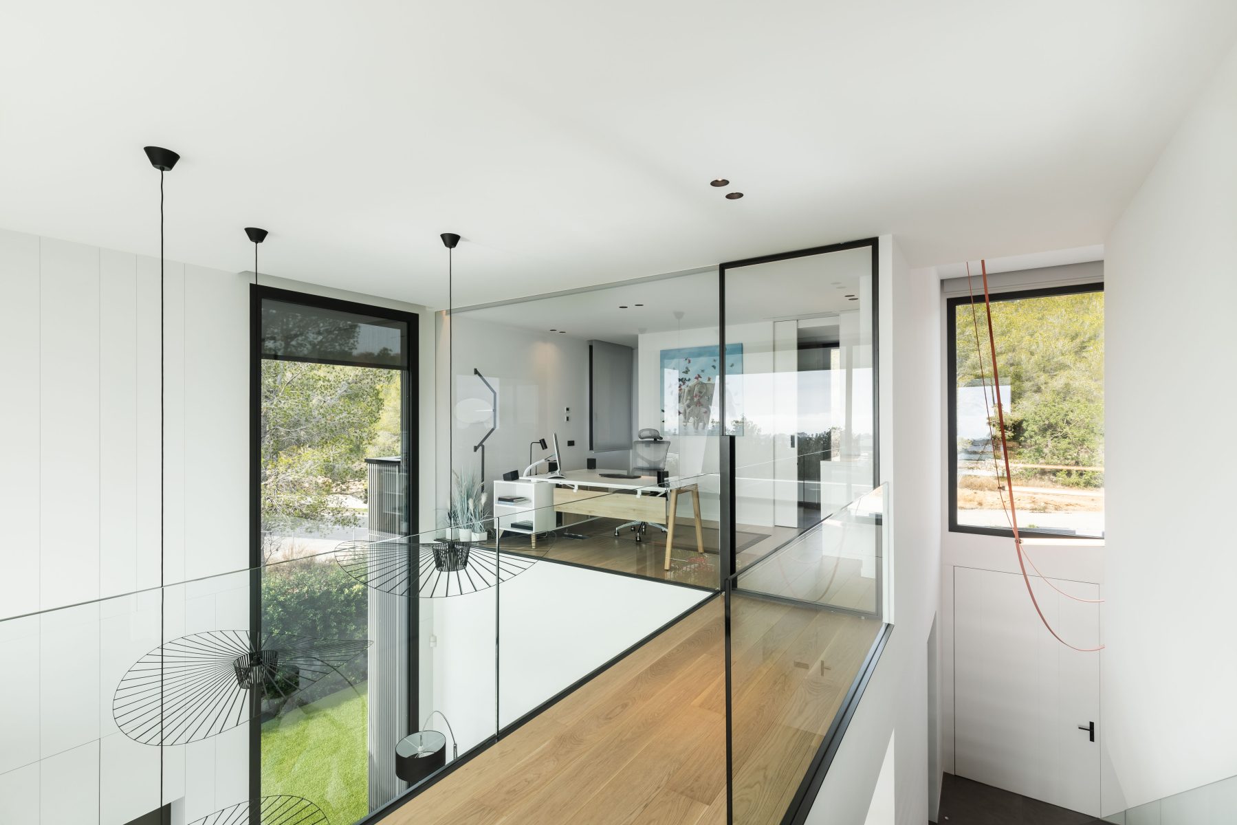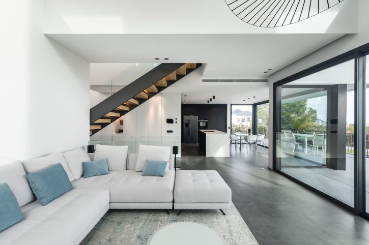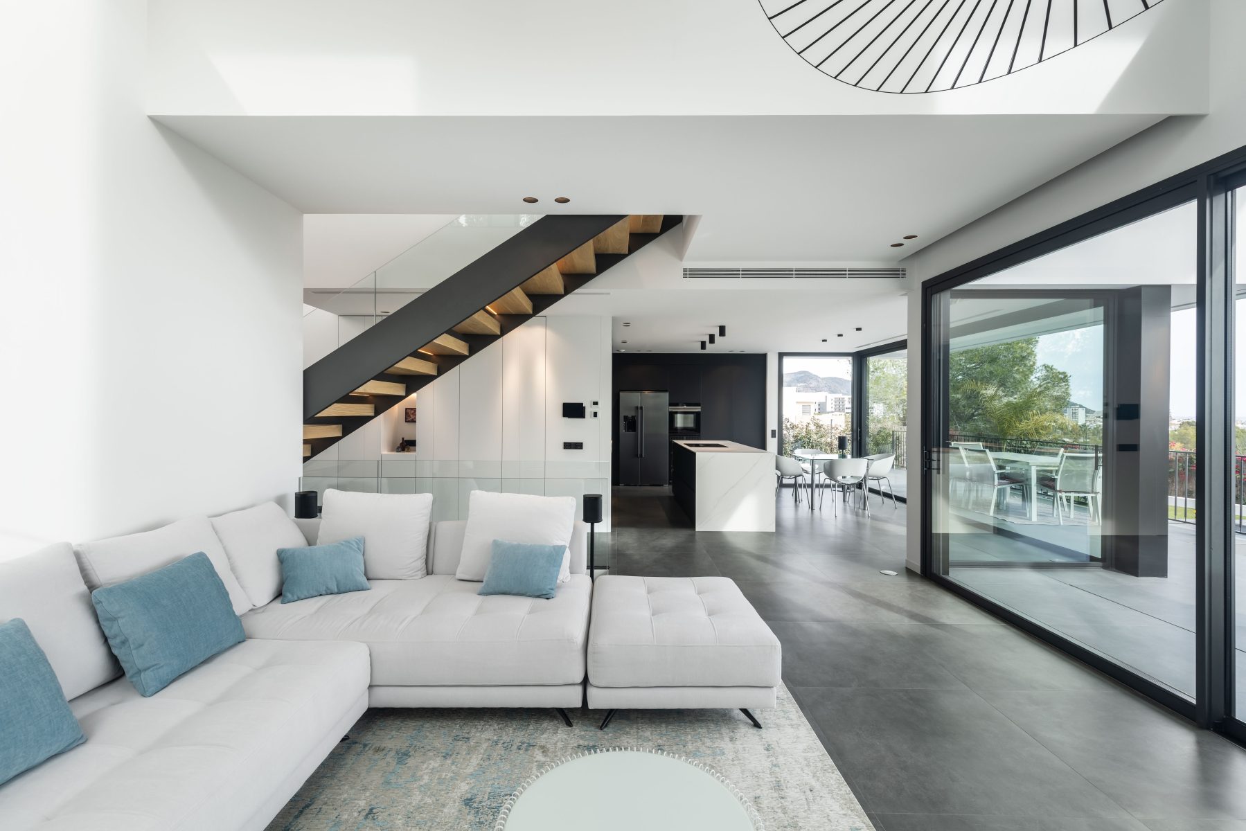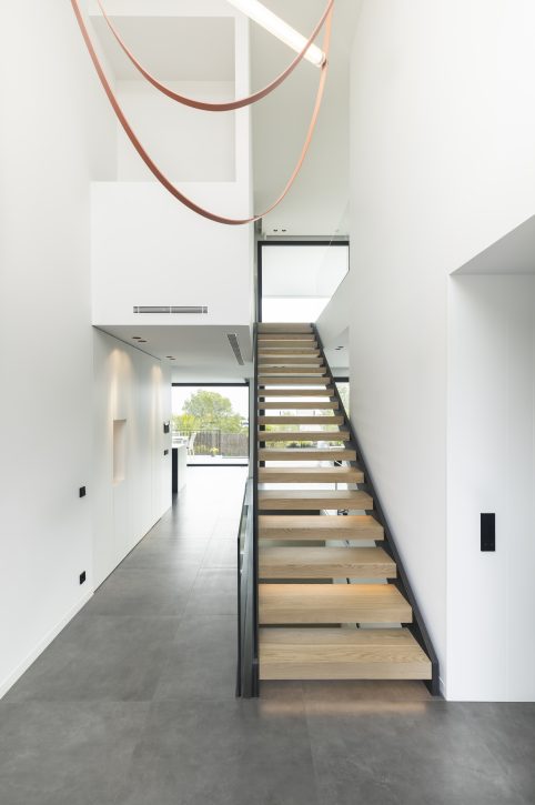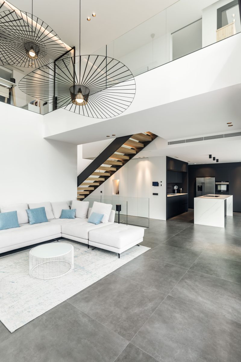 La conexión entre la planta baja y la primera planta se realiza a través de dos grandes espacios a doble altura, los cuales transmiten una sensación de amplitud y luminosidad desde el momento en que se cruza el umbral de la entrada. El primer espacio, ubicado en el hall de entrada, permite distinguir el pasillo principal y el mar al fondo, creando una bienvenida espectacular. La escalera, situada en el pasillo principal, está diseñada con elementos transparentes que realzan las vistas al Mediterráneo. El segundo espacio a doble altura, situado en la zona de estar, añade un toque de generosidad al ambiente y apertura, convirtiéndolo en el corazón social de la vivienda.