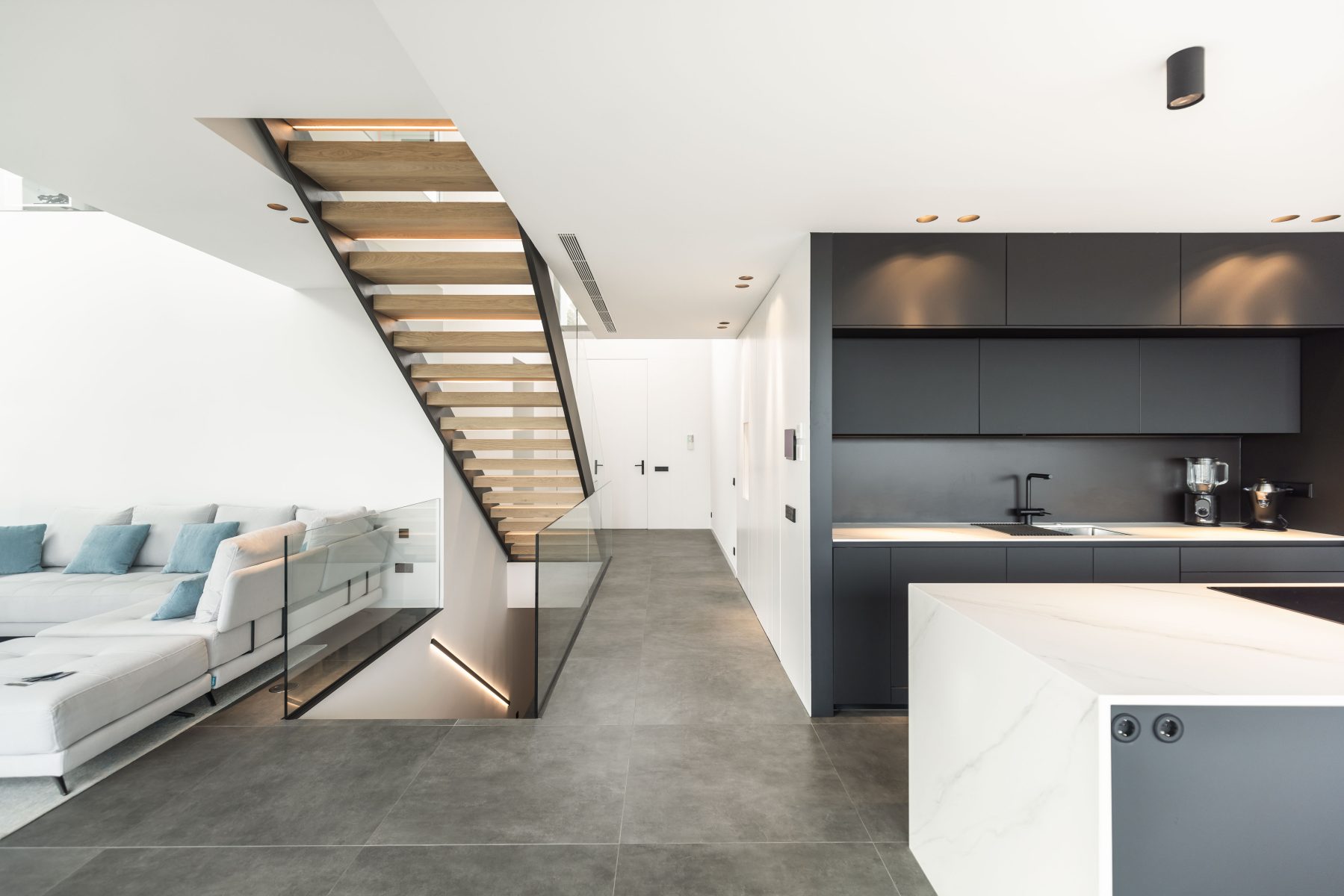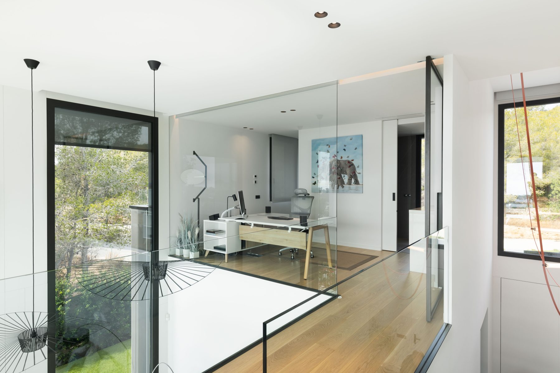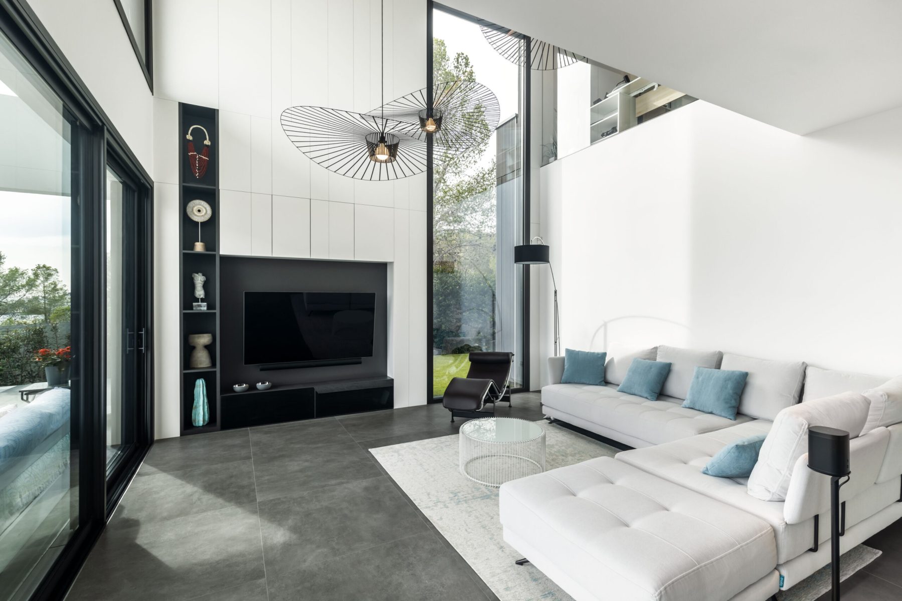 La conexión entre la planta baja y la primera planta se realiza a través de dos grandes espacios a doble altura, los cuales transmiten una sensación de amplitud y luminosidad desde el momento en que se cruza el umbral de la entrada. El primer espacio, ubicado en el hall de entrada, permite distinguir el pasillo principal y el mar al fondo, creando una bienvenida espectacular. La escalera, situada en el pasillo principal, está diseñada con elementos transparentes que realzan las vistas al Mediterráneo. El segundo espacio a doble altura, situado en la zona de estar, añade un toque de generosidad al ambiente y apertura, convirtiéndolo en el corazón social de la vivienda.