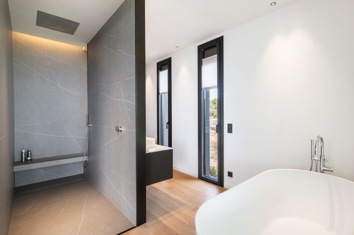 La planta baja de la vivienda acoge la zona de día, un espacio cómodo y versátil que incluye una suite para invitados. La primera planta está dedicada a la intimidad y el trabajo, con una suite principal que ofrece espectaculares vistas al mar Mediterráneo, y un despacho que también disfruta de estas impresionantes vistas, convirtiendo el trabajo en una experiencia placentera.