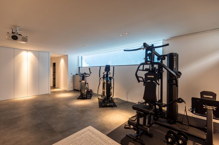 La planta sótano de la vivienda alberga la zona de servicios y una sala polivalente equipada con un gimnasio completo y una apertura en forma de ventana desde la que puede vislumbrarse el agua de la piscina, integrando el ocio y el bienestar en la vida diaria de los propietarios.