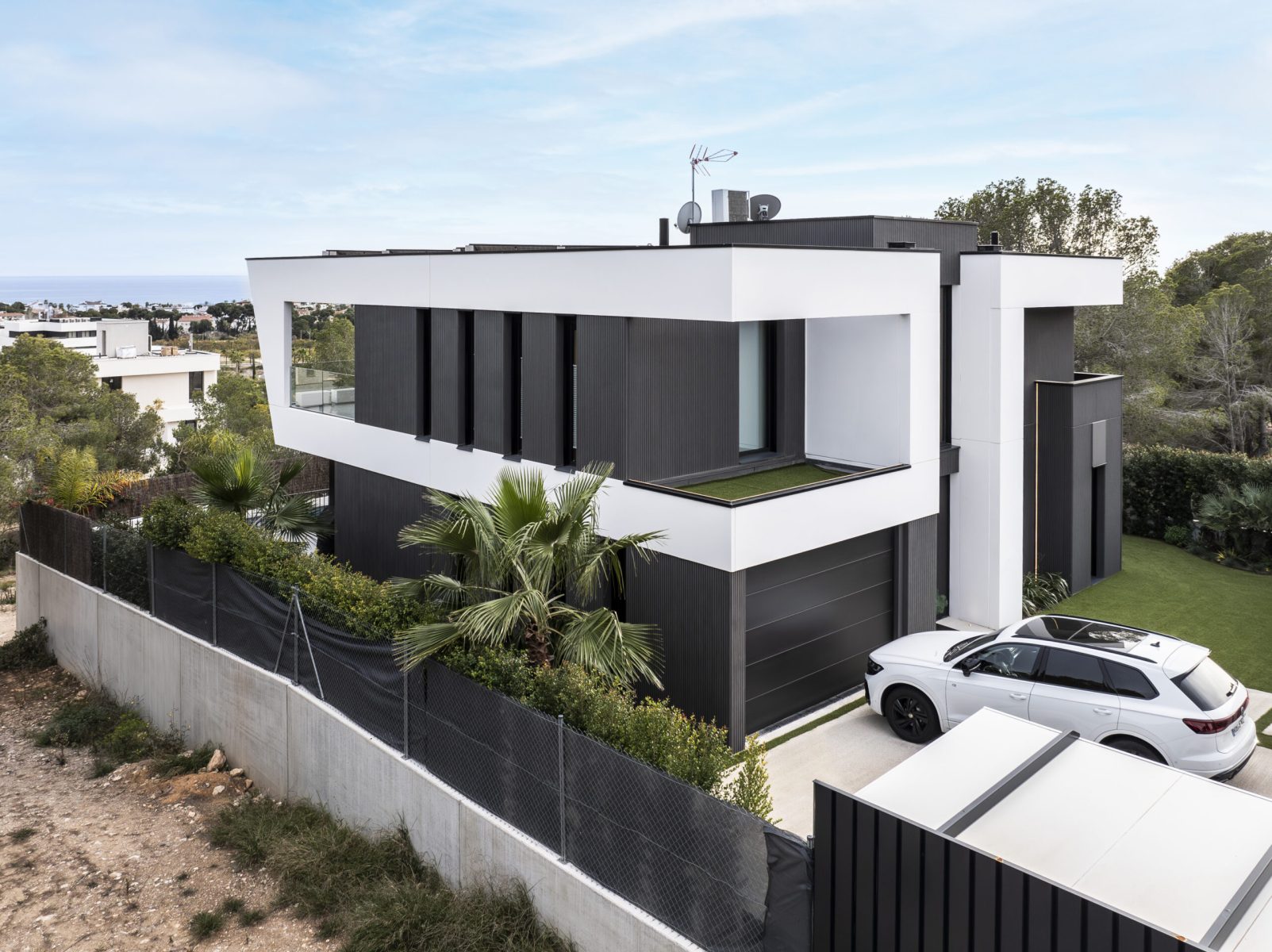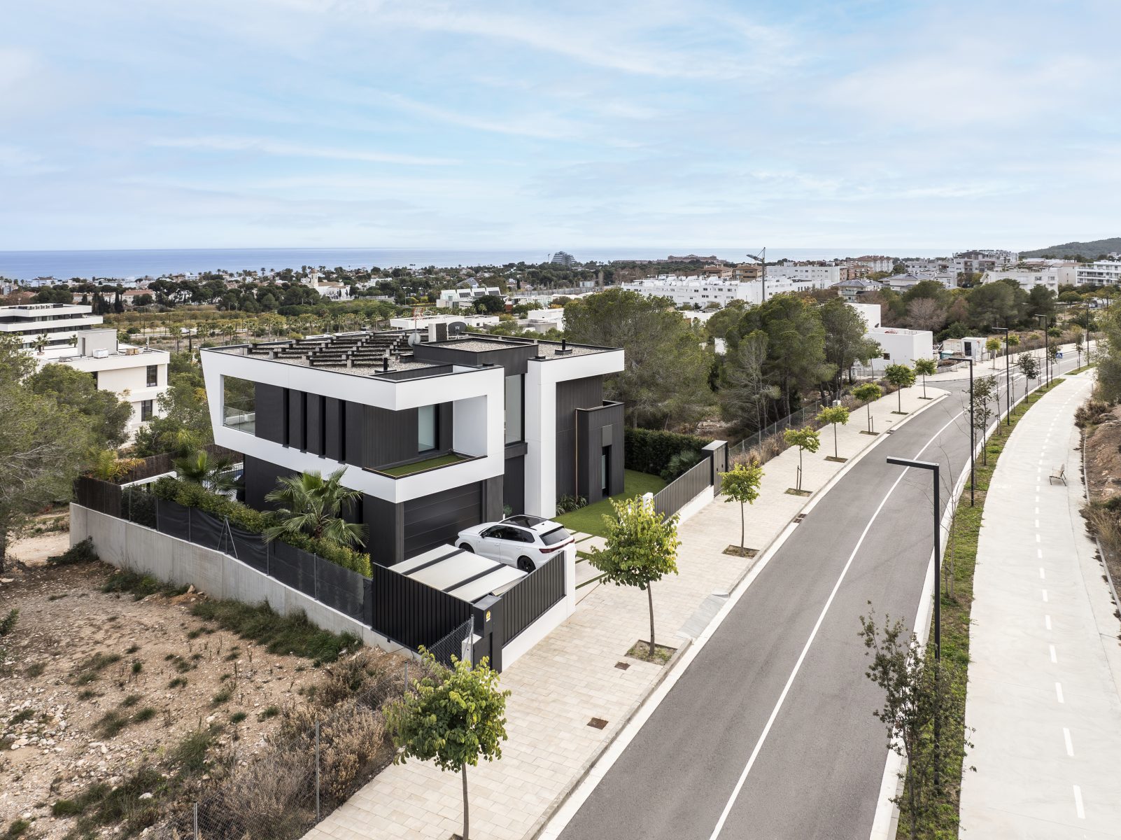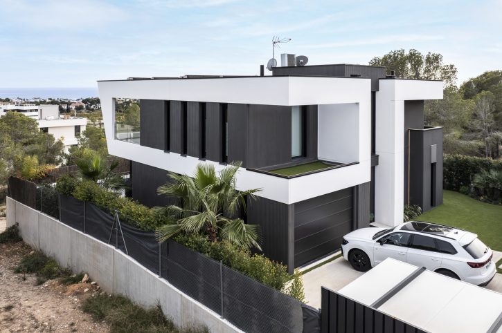 Cada fachada ha sido concebida con una intención arquitectónica específica. La fachada de la entrada pivota en relación con el acceso principal de la vivienda, creando una bienvenida distintiva. En la fachada este, se repite una apertura estrecha y vertical para el espacio de servicios y el baño de la primera planta, proporcionando flexibilidad y privacidad, un diseño que se replica en las otras fachadas. La fachada sur, completamente abierta, incluye los porches y la primera planta en forma de prisma orientada hacia el mar. La fachada oeste pivota en torno a una gran apertura hacia el doble espacio del salón y la cocina abierta, facilitando la entrada de luz natural desde el oeste, una característica muy apreciada por nuestros clientes.