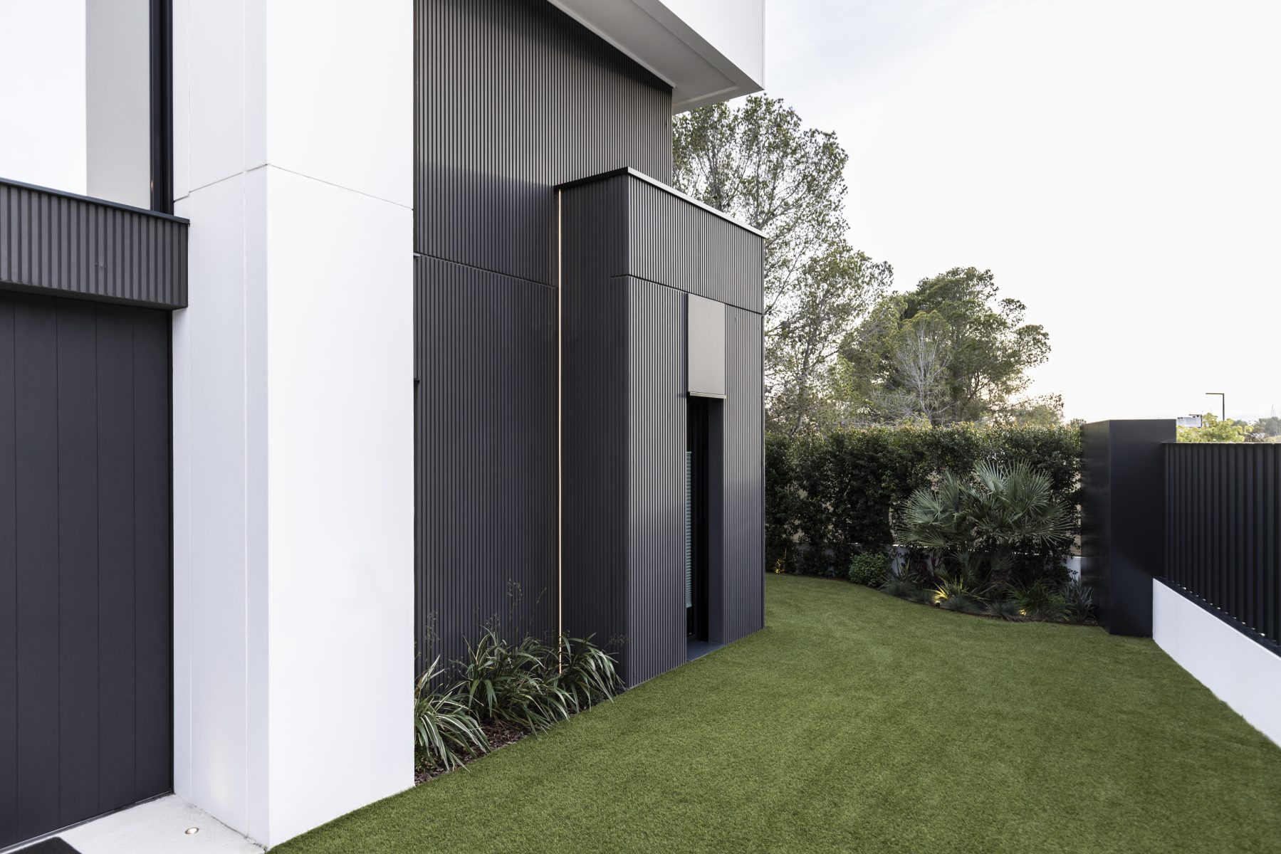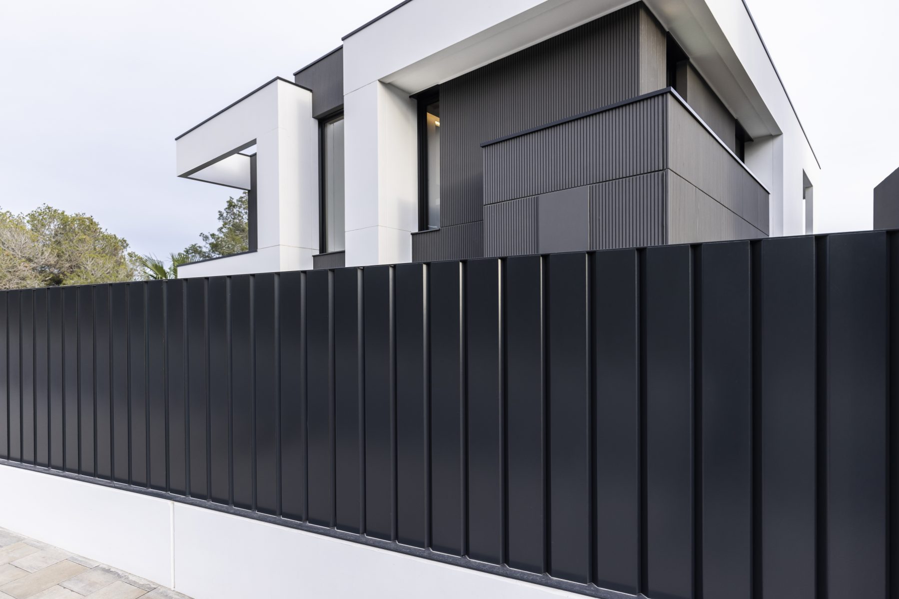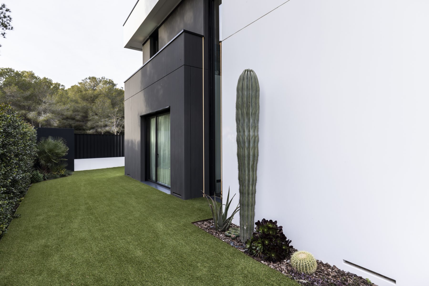 Cada fachada ha sido concebida con una intención arquitectónica específica. La fachada de la entrada pivota en relación con el acceso principal de la vivienda, creando una bienvenida distintiva. En la fachada este, se repite una apertura estrecha y vertical para el espacio de servicios y el baño de la primera planta, proporcionando flexibilidad y privacidad, un diseño que se replica en las otras fachadas. La fachada sur, completamente abierta, incluye los porches y la primera planta en forma de prisma orientada hacia el mar. La fachada oeste pivota en torno a una gran apertura hacia el doble espacio del salón y la cocina abierta, facilitando la entrada de luz natural desde el oeste, una característica muy apreciada por nuestros clientes.